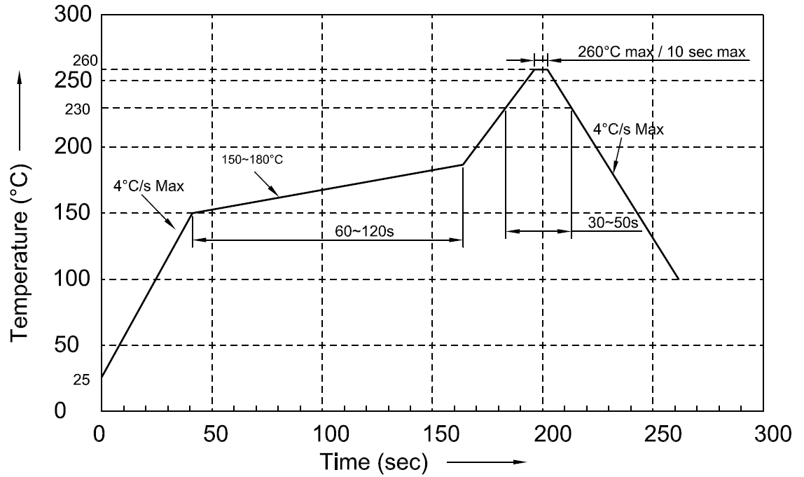 1. Nous recommandons la température de refusion de 245 ± 5 ℃. La température maximale de soudure doit être limitée à 260 ℃ pendant 10 s (max).