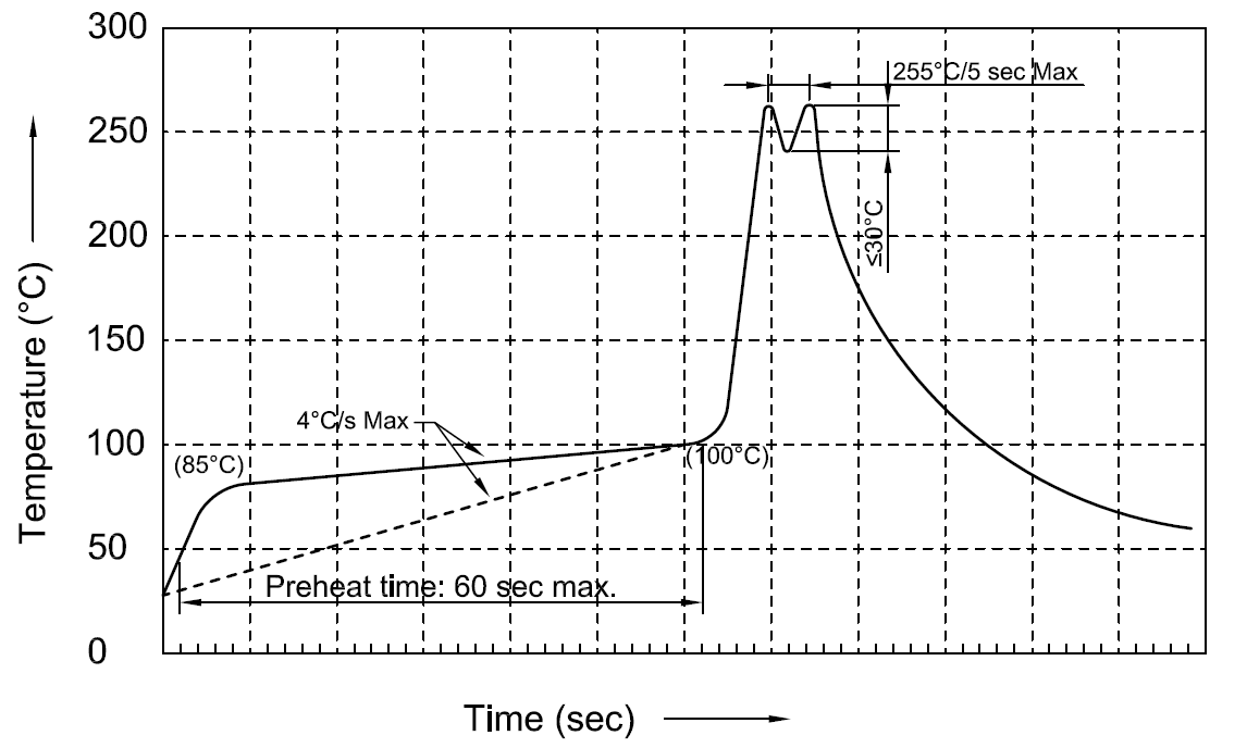 2. Température de soudure maximale entre 245 et 255 ℃ pendant 3 secondes (5 secondes maximum).